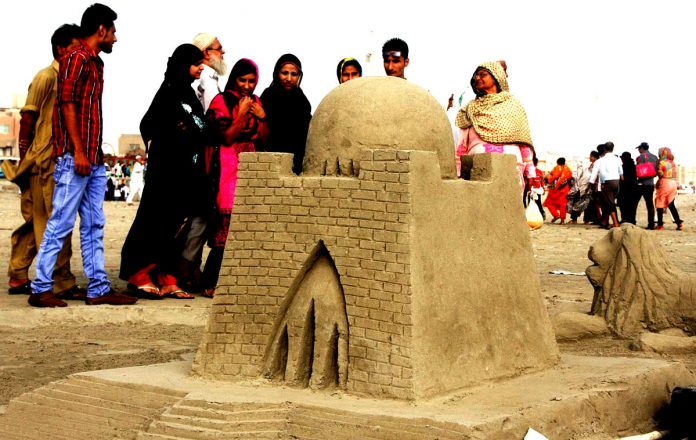 People Look At Sand Model Of Quaid-e-Azam Mausoleum Created By An Artist