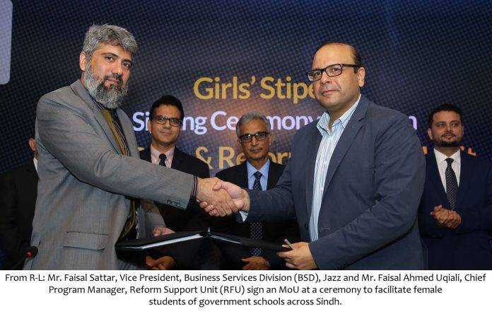 Islamabad/Karachi – May 10, 2017: The Reform Support Unit (RSU), School Education Department, Government of Sindh have a mandate to disburse stipends to female students of Sind. A signing ceremony was held at a local Hotel in Karachi today to award the contract for disbursement of these bursaries to JAZZ CASH. Payments will be made in two streams of Rs. 3,500 and Rs. 2,500 in 45 Talukas and 76 Talukas respectively where the transition rate is low.