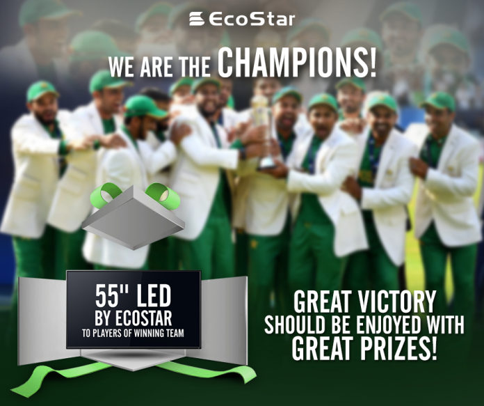 Lahore: 21st June, 2017 – EcoStar is a nationwide brand of electronics which believes that a great victory should be enjoyed with great prizes. In order to celebrate Pakistan’s glorious victory in the Champion’s Trophy, EcoStar has announced to gift 55” LED TV set to all players of our National Cricket team.