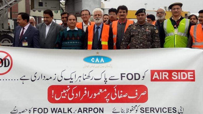 Today on 07th February 2019, Pakistan Civil Aviation Authority Allama Iqbal International Airport Management held Safety Awareness Session and FOD (Foreign Object Debris) awareness walk on Airside. The session was attended by officials of CAA, ASF, ANF, PIA and other International and Local airlines followed by FOD Walk. The walk was led by Airport Manager, Sardar Tahir Sikandar along with DMR Safety & Quality Management System, CSO ASF Mr. Tasleem Akhtar, Chairman Airlines Operator Committee (AOC), Station Managers of PIA, Emirates, Gulf Air and other Airline / GSA’s. Large number of operational personal participated in the event and pledged to play their vital role in maintaining safe environment for Aircraft Operations at AIIAP, Lahore. At the end of event, the participants were sensitized by APM regarding the importance of safety culture in aviation.