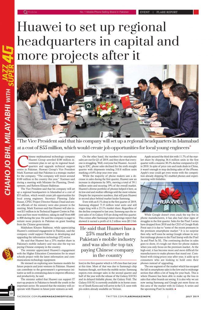 Chinese multinational technology company Huawei Group unveiled $100 million investment plan to set up its regional headquarters and upgrade technical support centre in Pakistan. Huwaei Group’s Vice President Mark Xueman said that Pakistan is a strategic market for the company. “The company will invest around $100 million in the country this year,” Xueman said during a meeting with Minister for Planning, Development, and Reform Khusro Bakhtyar.