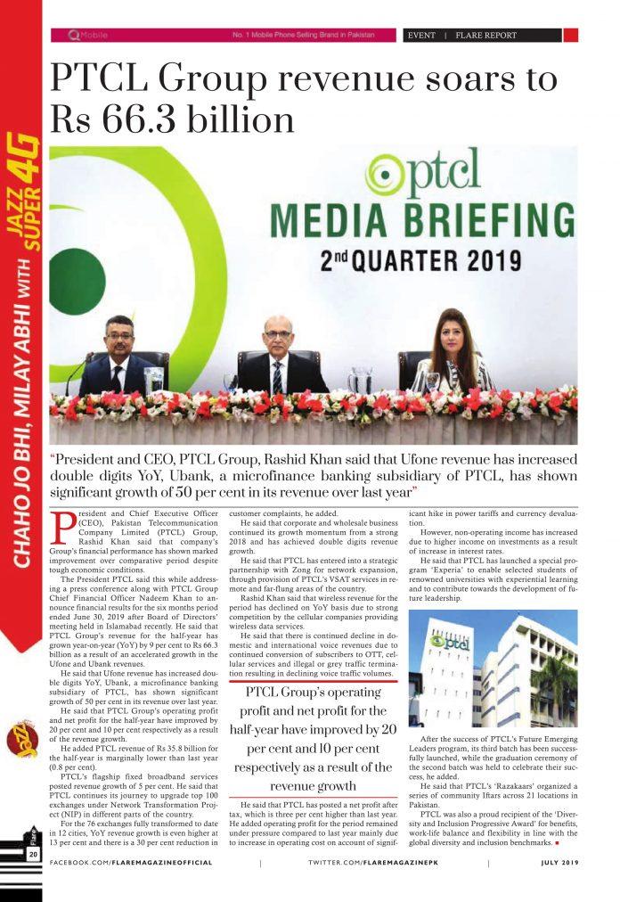 The President PTCL said this while addressing a press conference along with PTCL Group Chief Financial Officer Nadeem Khan to announce financial results for the six months period ended June 30, 2019 after Board of Directors’ meeting held in Islamabad recently. He said that PTCL Group’s revenue for the half-year has grown year-on-year (YoY) by 9 per cent to Rs 66.3 billion as a result of an accelerated growth in the Ufone and Ubank revenues.