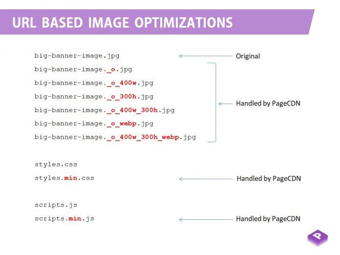 At PageCDN, many optimizations work through URIs and do not require any configuration. It allows you to specify hints in the URL to indicate required optimizations. The available optimizations are: