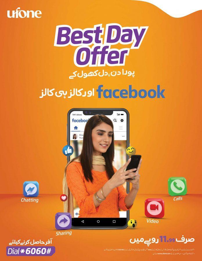 Pakistani Telecom Company Ufone, has always strived towards facilitating its customers by offering affordable packages packed with convenience. Ufone’s best day offer allows customers to enjoy 500 MB Facebook and 500 U-U and U-PTCL minutes in just Rs. 11.99, giving them the freedom to call or chat whenever they want to and for as long as they desire.