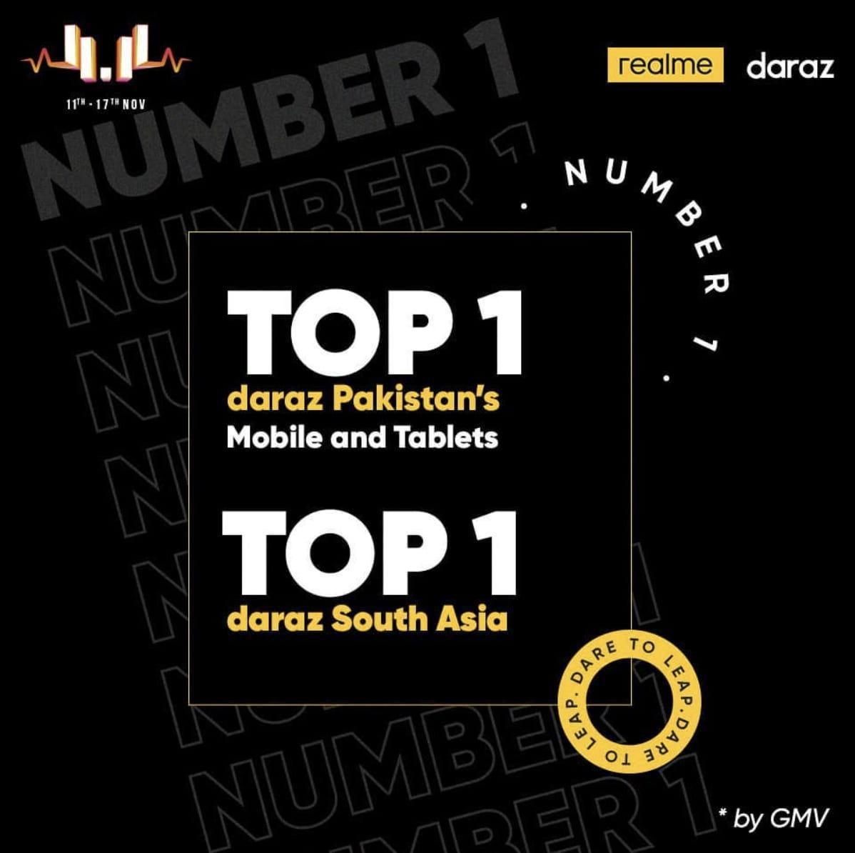 realme Pakistan is recognized as the Top selling smartphone brand in the country on Daraz 11 11 Sale. The Gross Merchandise volume of realme on Daraz 11 11 is higher than leading smartphone brands. In addition to this realme secured Top 1 position in South Asia region for Daraz 11 11 as well.