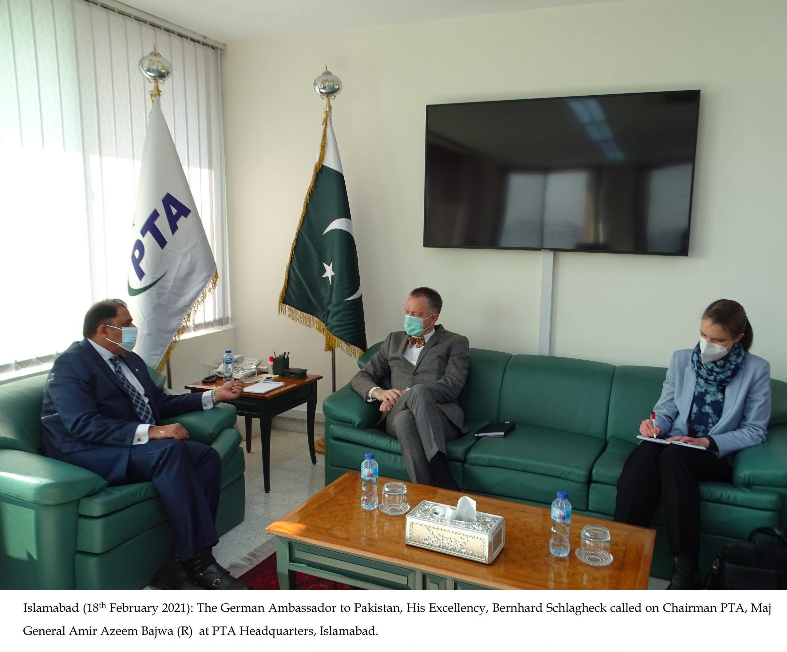 The German Ambassador to Pakistan, His Excellency, Bernhard Schlagheck called on Chairman PTA, Maj General Amir Azeem Bajwa (R) at PTA Headquarters, Islamabad today.