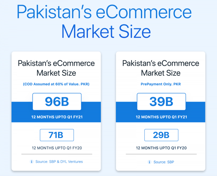 State Bank of Pakistan (SBP) upto Q3 2020 (Q1 FY21), the eCommerce market size for the year upto Q3 2020 was 96B PKR (assuming a 60% COD volume), prepayment was 39B over the same period. There are now 2,164 merchants who accept prepayment methods which is a large jump from the previous quarter. There are now 43k orders a day via prepayment method (in Q3 2020) on Pakistani merchants, which is up from 24k and 13k in the same quarter in 2019 and 2018.