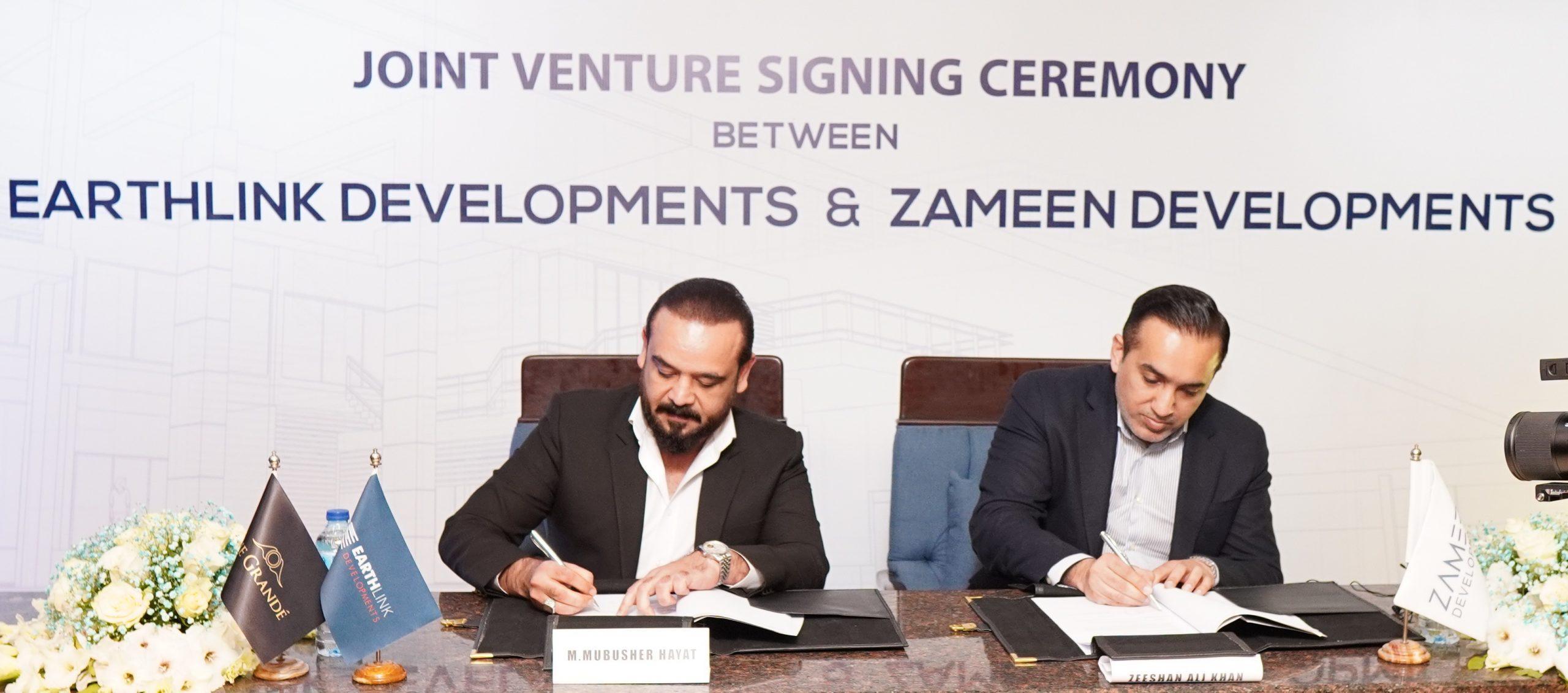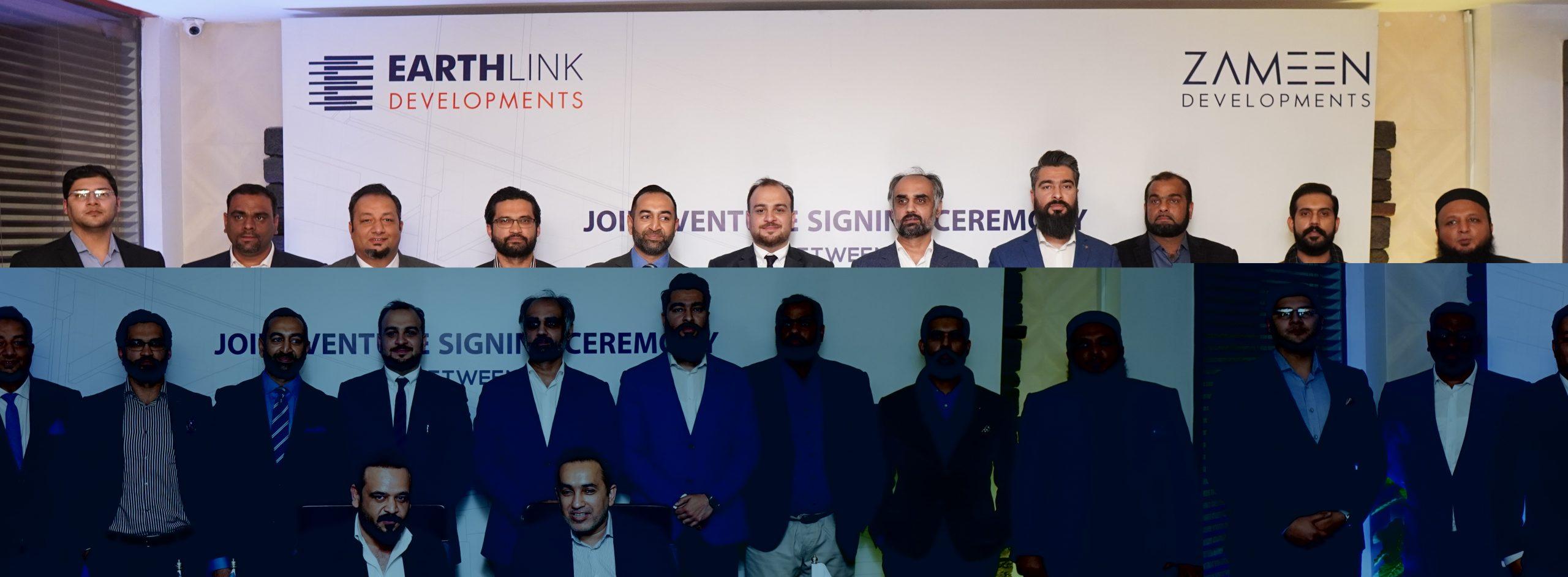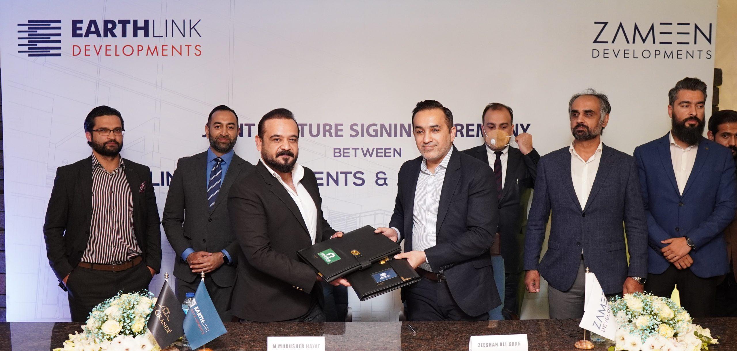 Islamabad: Zameen Developments, the development arm of Pakistan’s leading property portal Zameen.com, and Earthlink Developments have signed a memorandum of understanding (MoU) to construction a multipurpose project enjoying a prime location in Bahria Town Islamabad. CEO Zameen.com and Zameen Developments Zeeshan Ali Khan and CEO Earthlink Developments Mubusher Hayat signed the agreement. Country Head Zameen.com Ahmed Hussain Bhatti, Senior Director North Hasan Danish, Director Zameen Developments Fahad Arif Khawaja, Director Affiliates and Acquisition Adil Kamal, Director Project Sales Khurram Hussain and Earthlink Developments Director Compliance and Legal Affairs Fawad Muslim and Director Projects and Developments Jamal S Kakakhel were present on the occasion.