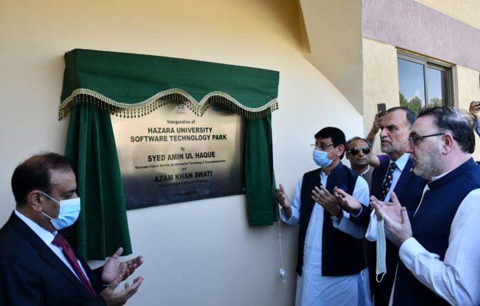 Islamabad: Friday, 24, September, 2021: Ministry of IT and Telecom (MoITT) established a Software Technology Park (STP) at Hazara University Mansehra. Federal Minister for IT Syed Aminul Haq alogwith Minister for Railways Azam Khan Swati innaugrated the STP here at Mansehra a District of KPK Province. Vice Chancellor Dr. Jamil Ahmed, Chief Executive Ignite Mr. Asim Shehryar, Member International Coordination Ajmal Awan, large number of dignitaries and students were also attended the inauguration ceremony.