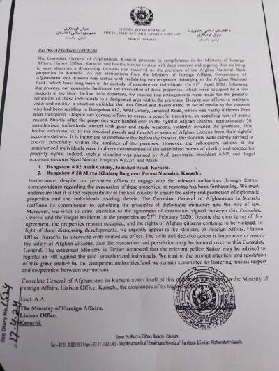 Islamabad – Zubair Kasuri: The Consul General of Afghanistan in Karachi has urgently requested assistance from Pakistan’s Ministry of Foreign Affairs and Ministry of Interior regarding the illegal occupation of two Afghan properties in Karachi. Bungalow No. 2 on Mirza Khaliq Baig Road and another property owned by the Afghan National Bank have been unlawfully seized by a local party. The provincial president, Asif, and students Syed Nawaz Usman Wazir and Aftab, are reported to be involved in this occupation.