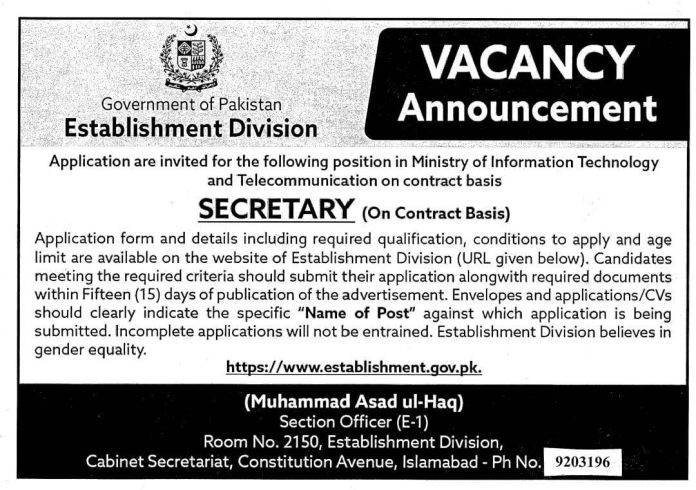 The Ministry of Information Technology and Telecommunication has announced a vacancy for the position of Secretary on a contract basis. The application process has begun, and interested candidates can submit their applications within 15 days of publication of this advertisement.