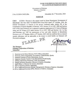 Islamabad,Zubair kasuri, The Pakistani government has authorized the deployment of 31 units of the Pakistan Army and 107 wings of the Frontier Corps (FC) to Balochistan province to maintain law and order. The deployment was requested by the Balochistan Home Department and will be in effect from October 15, 2024, to October 14, 2025.