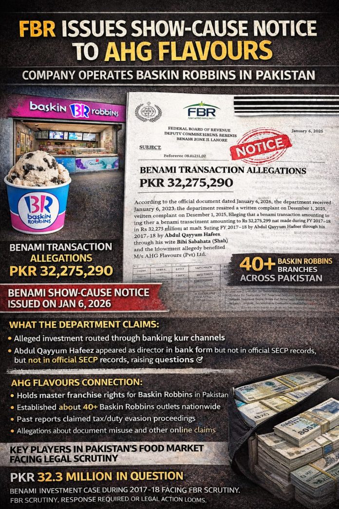 LAHORE: The Federal Board of Revenue (FBR), through the Office of the Initiating Officer, Deputy Commissioner Inland Revenue, Benami Zone-II Lahore, has issued a show-cause notice under Section 22(1) of the Benami Transactions (Prohibition) Act, 2017 in a case linked to M/s AHG Flavours (Pvt.) Ltd., the company that operates Baskin Robbins Pakistan.