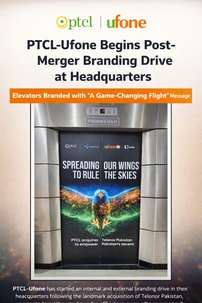 PTCL-Ufone Begins Post-Merger Branding Drive at Headquarters, Elevators Branded with “A Game-Changing Flight” Message