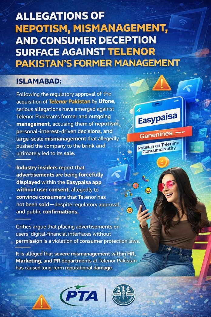 Islamabad: News desk: Following the regulatory approval of the acquisition of Telenor Pakistan by Ufone, serious allegations have emerged against Telenor Pakistan’s former and outgoing management, accusing them of nepotism, personal-interest–driven decisions, and large-scale mismanagement that allegedly pushed the company to the brink and ultimately led to its sale.